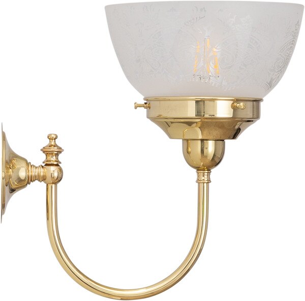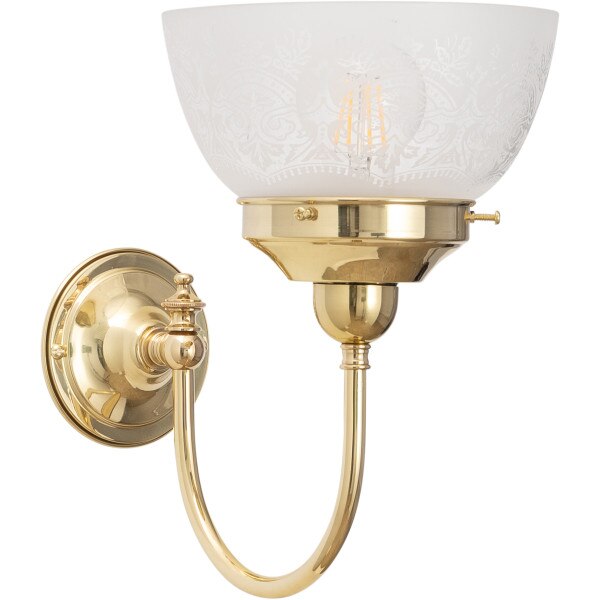 A refined wall light crafted from solid polished brass and paired with the beautifully detailed Keon frost-etched shade. Featuring a Victorian-inspired design, it diffuses light softly while adding vintage character to hallways, bedrooms, or living spaces. Perfect for traditional interiors seeking timeless charm.