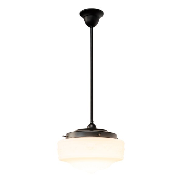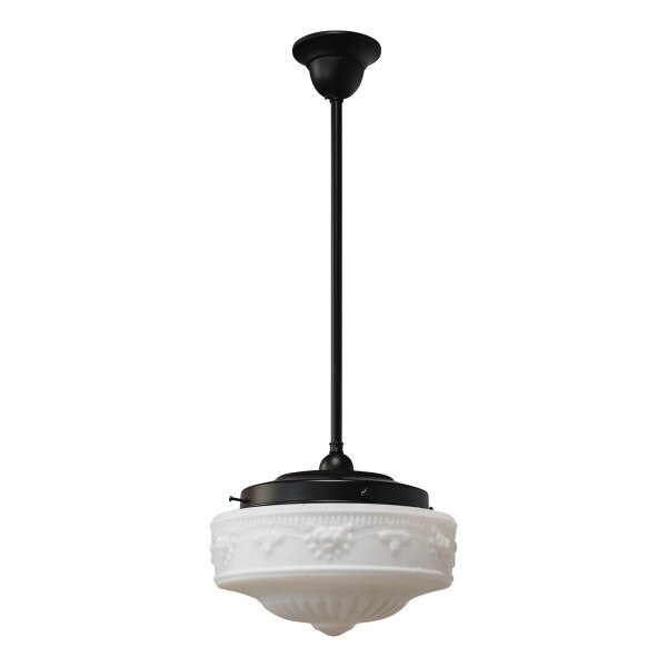 The Senator 11'' Opal Matte on Rod Set 1/2'' x 1/2m Patina combines the best of heritage lighting with the elegance of Edwardian-era design, exuding timeless sophistication. The classic glass shade, adorned with a raised floral vine motif, brings vintage charm to bedrooms, hallways, bathrooms or living areas. Suspended by rod set manufactured from high-quality solid brass, it offers warm ambient lighting while enhancing traditional interiors with its refined and enduring style.